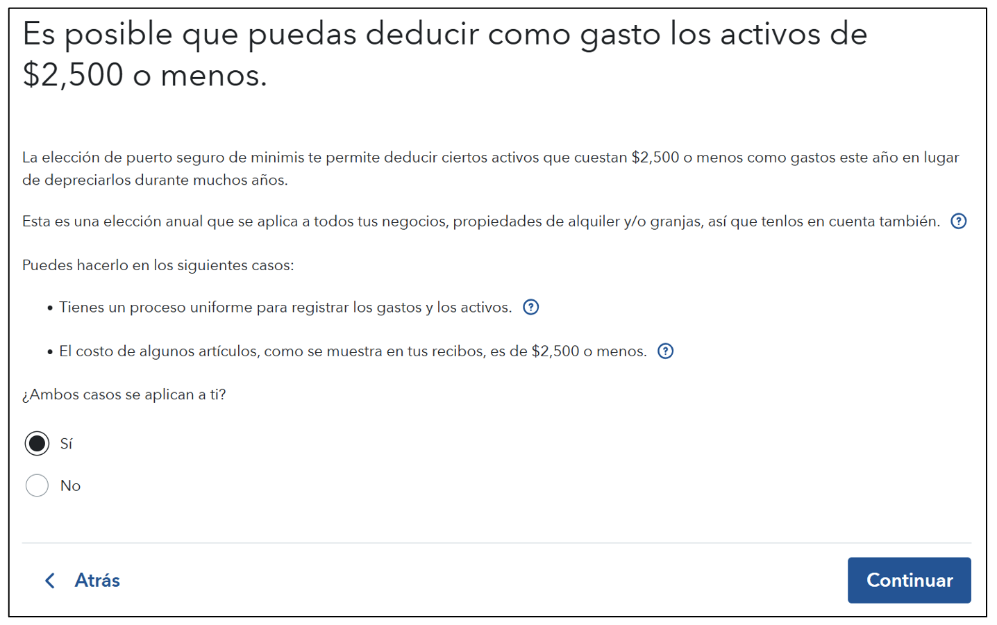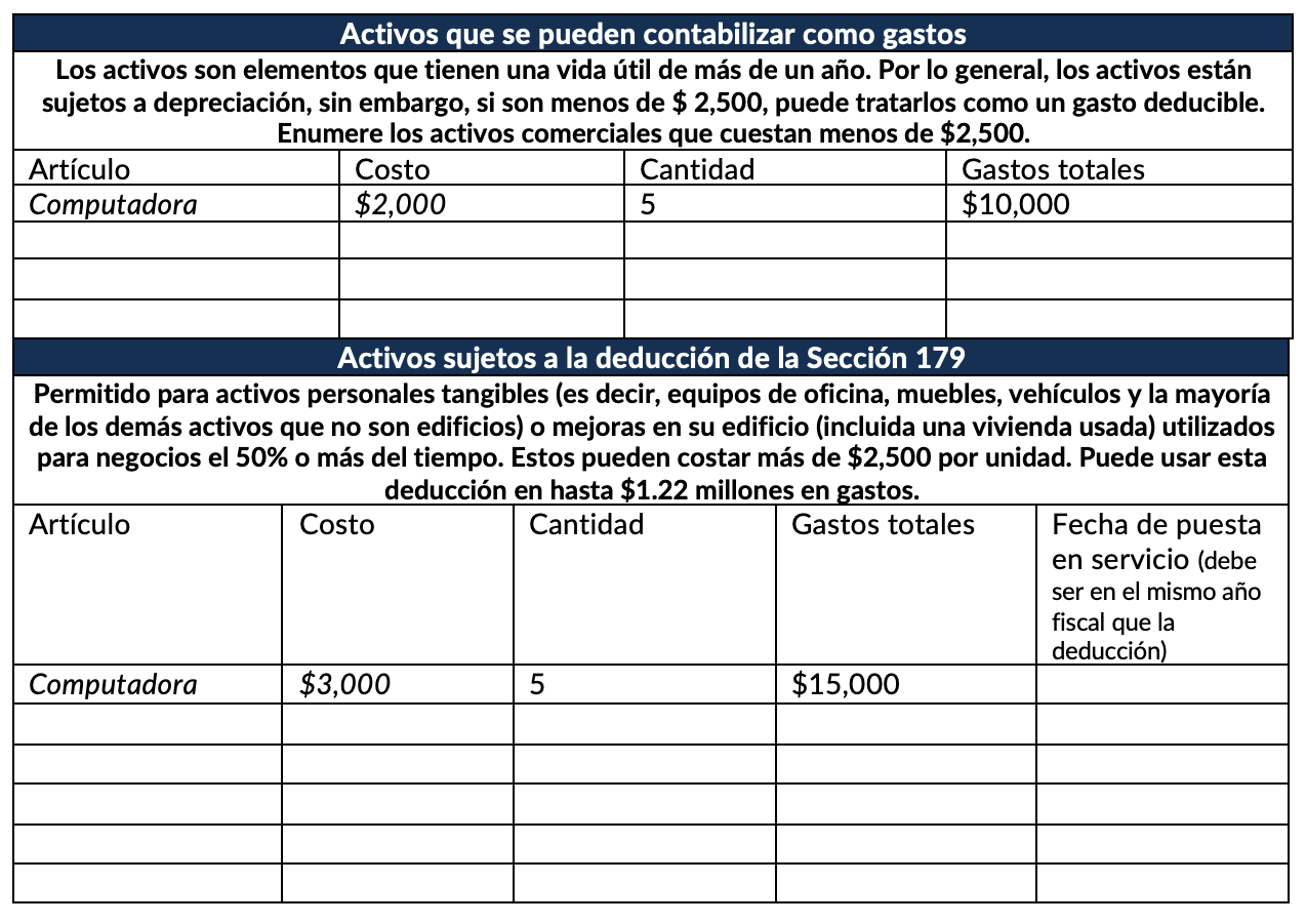 Si tiene activos que cuestan $2,500 o menos, tiene opciones para tratarlos como gastos en lugar de activos y deducirlos por completo en un año. A esto se le llama la Elección de Puerto Seguro de Minimis. Aprovechar la elección de puerto seguro de minimis puede reducir sustancialmente la carga del impuesto sobre la renta de su empresa. Si usa esta regla, asegúrese de que usted, o su preparador, incluya una declaración que diga: