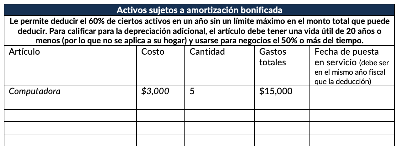 La Sección 179 permite a los contribuyentes deducir como gasto de ciertos activos tangibles como gasto en el año en que se ponen en servicio. La propiedad debe utilizarse para más del 50% de su negocio, por lo que no debe ser una propiedad que se utilice principalmente para uso personal. Los edificios y terrenos no califican para la Sección 179, pero las mejoras de los edificios sí. En 2025, puede gastar hasta $2.5 millones en propiedades elegibles. Esta deducción también está limitada por los ingresos netos de su negocio para el año. No puede deducir más dinero del que ganó. En ese momento, puede optar por tomar la depreciación regular de los activos restantes o utilizar el resto de su deducción en el siguiente año fiscal.