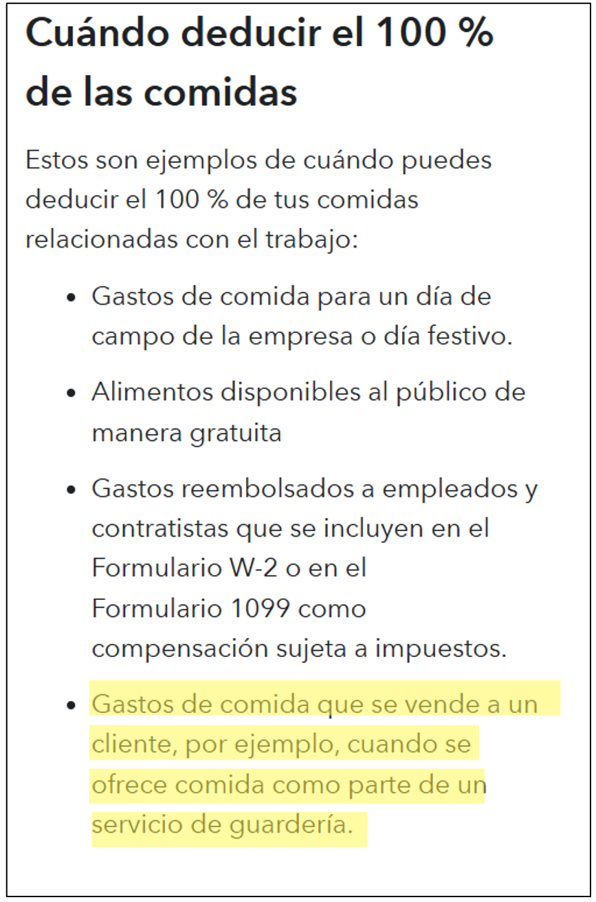 NOTA IMPORTANTE: TurboTax proporciona orientación inexacta cuando se trata de proveedores que participan en el programa de alimentos a quienes se les reembolsan los costos de alimentos. El sistema aconseja: "Si se le reembolsan las comidas o los refrigerios, puede deducir solo la parte de la asignación estándar que exceda el reembolso". El IRS no recomienda usar este método. En su lugar, recomiendan declarar los costos totales de los alimentos como un gasto y los reembolsos completos del programa de alimentos como ingresos. Por lo tanto, los proveedores deben ingresar sus costos totales, no solo la diferencia entre sus costos y reembolsos.