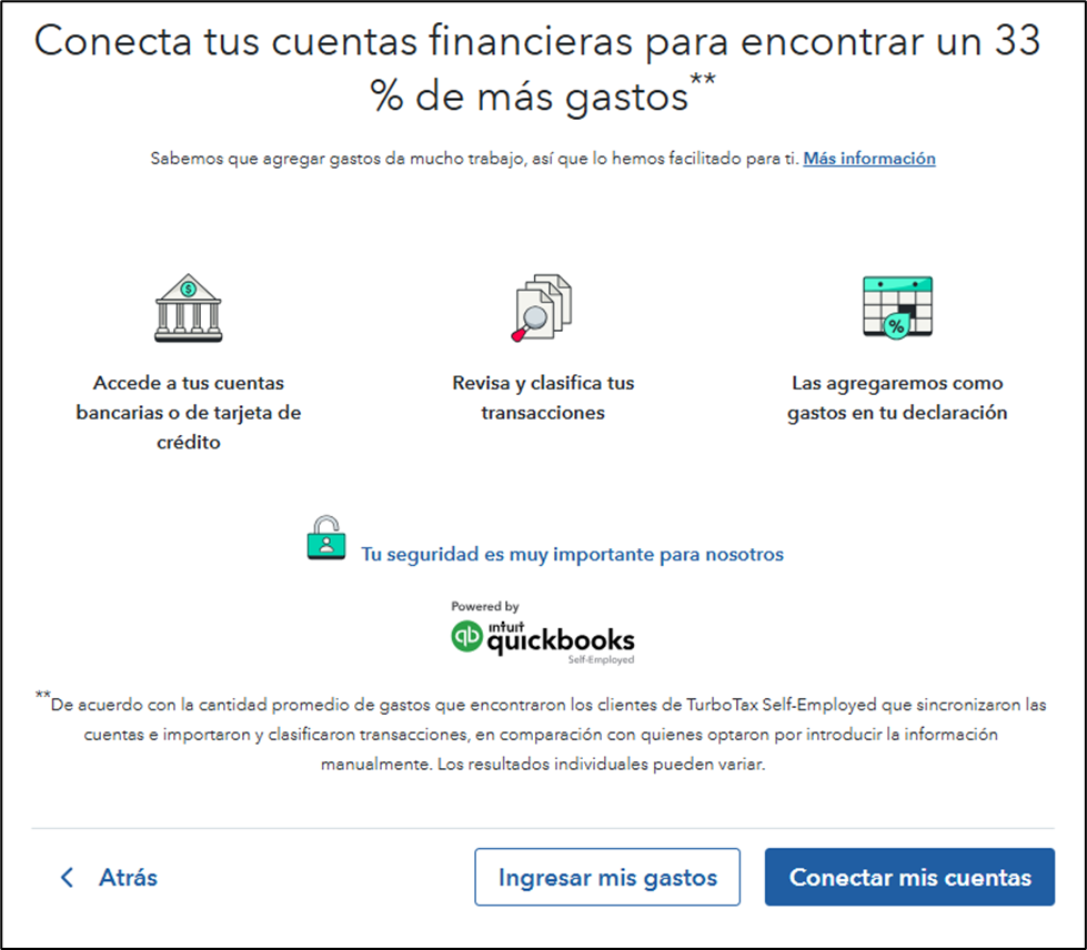 El sistema primero le preguntará si desea conectar sus cuentas. Esta guía le ayuda a ingresar sus gastos de forma manual para reducir el riesgo de que los gastos se clasifiquen de manera incorrecta. El software intenta clasificar los gastos según las descripciones de las transacciones del banco o del comercio. Esto puede causar errores porque las descripciones predeterminadas no siempre se transfieren con precisión. Para seguir los pasos de esta guía, elija Ingresar mis gastos.