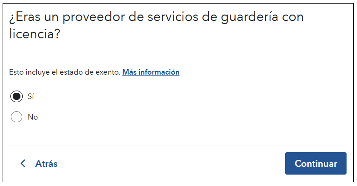 Cuando TurboTax le pregunta si usted fue un “licensed daycare provider” (proveedor de cuidado infantil con licencia), la definición del IRS es más amplia que la terminología que usa su estado. Para fines de impuestos federales, “licensed” incluye proveedores que están con licencia, registrados, certificados, listados, aprobados o legalmente exentos, siempre que operen bajo las normas estatales. Por ejemplo, en Texas, los Listed y Registered Family Child Care Homes no se llaman “licensed” según la clasificación del estado. Sin embargo, sí se consideran proveedores con licencia para efectos del IRS y de TurboTax, porque están legalmente aprobados y regulados. Si usted opera legalmente bajo las normas estatales de cuidado infantil, por lo general debe responder Sí.