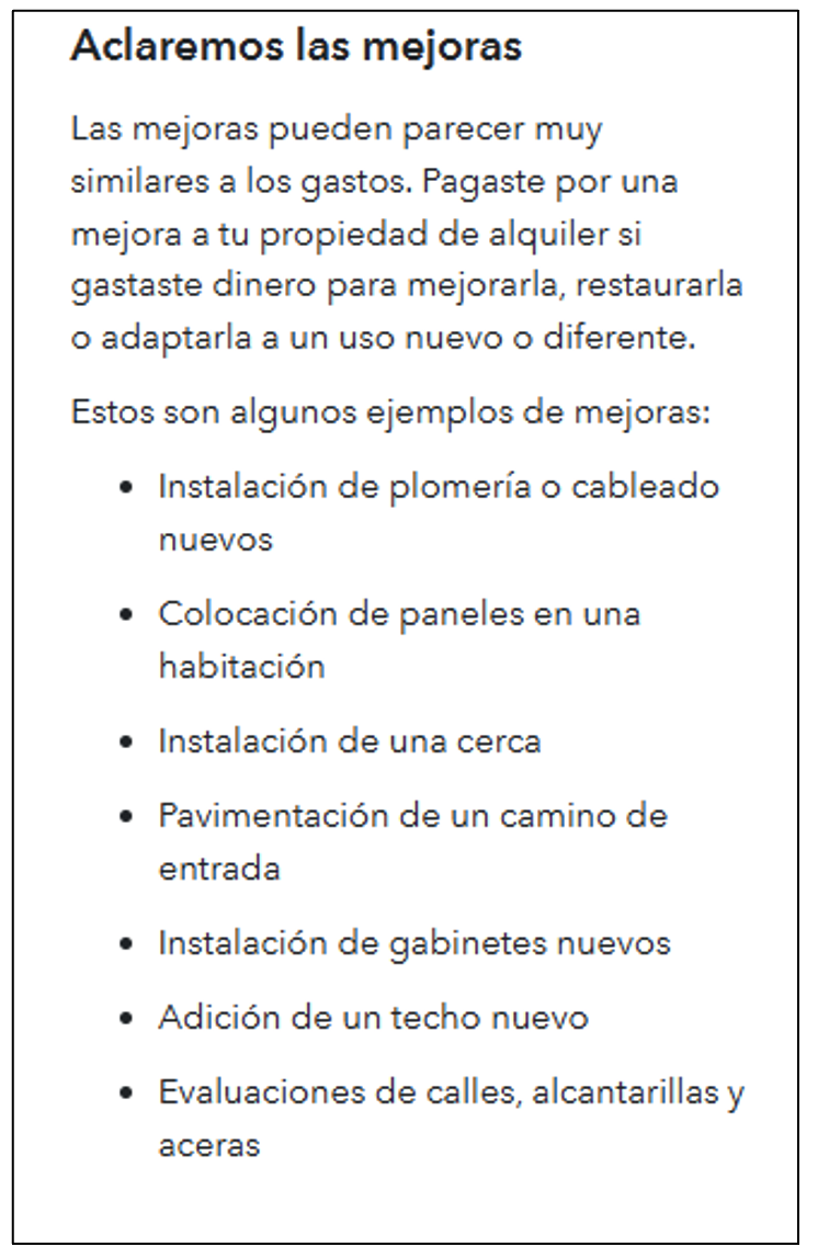 Es posible que tenga curiosidad sobre en qué consiste una mejora. Una mejora se diferencia de una reparación porque no tiene como objetivo que algo vuelva a funcionar, sino que mejora o agrega valor a la vivienda. TurboTax proporciona una lista de ejemplos de mejoras para el hogar: