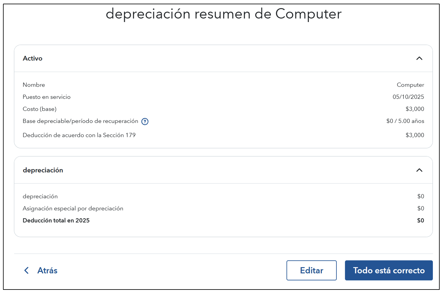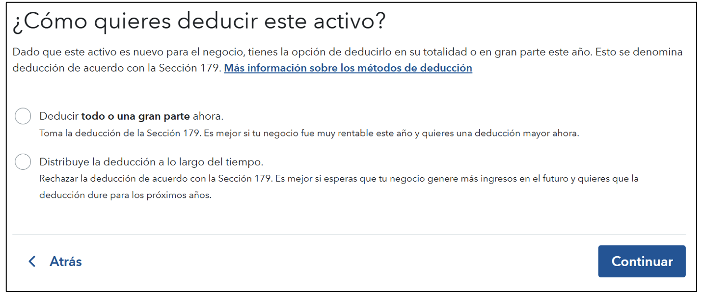 Si este es el primer año en que el activo se puso en servicio, puede deducir su valor total en lugar de depreciarlo durante varios años. TurboTax le presentará las siguientes opciones para deducir el activo: