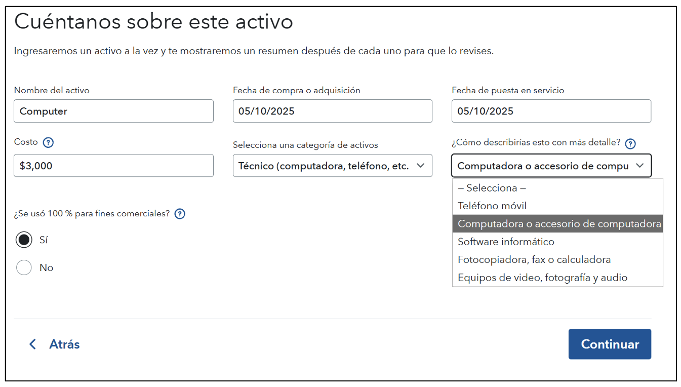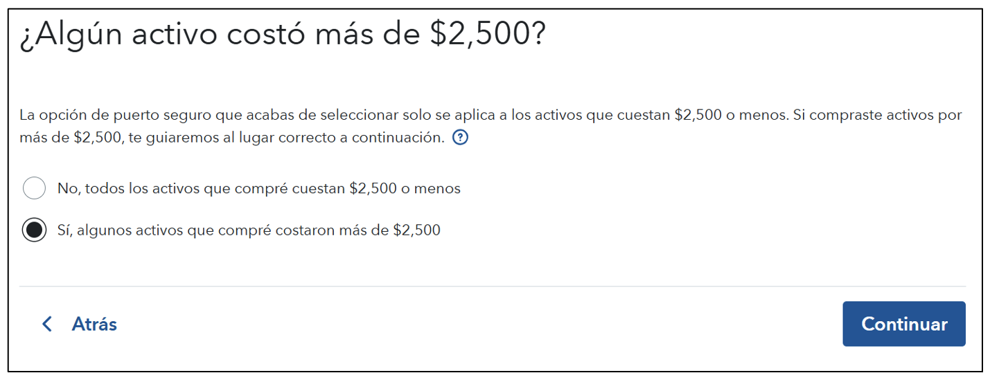 En el caso de los artículos que cuesten más de $2,500, deberá introducir detalles sobre el artículo, además de la fecha en que se puso en servicio para su empresa.