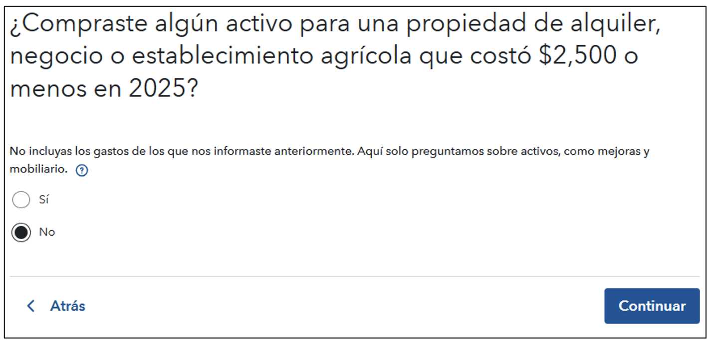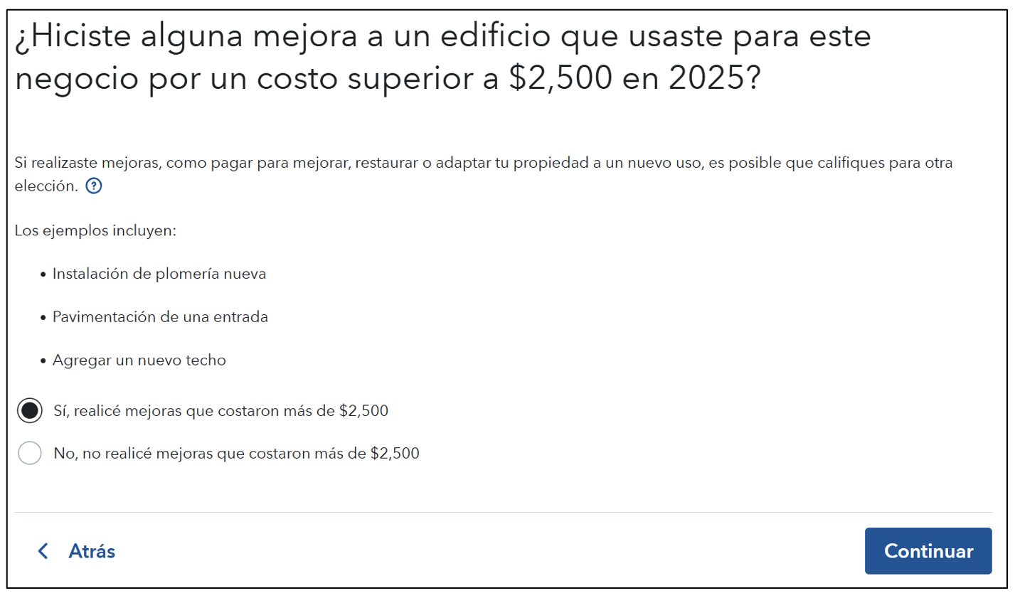 A continuación, TurboTax le preguntará sobre cualquier activo comercial que tenga que no esté cubierto por sus elecciones. Por ejemplo, compras grandes de más de $2,500 o mejoras de más de $10,000.