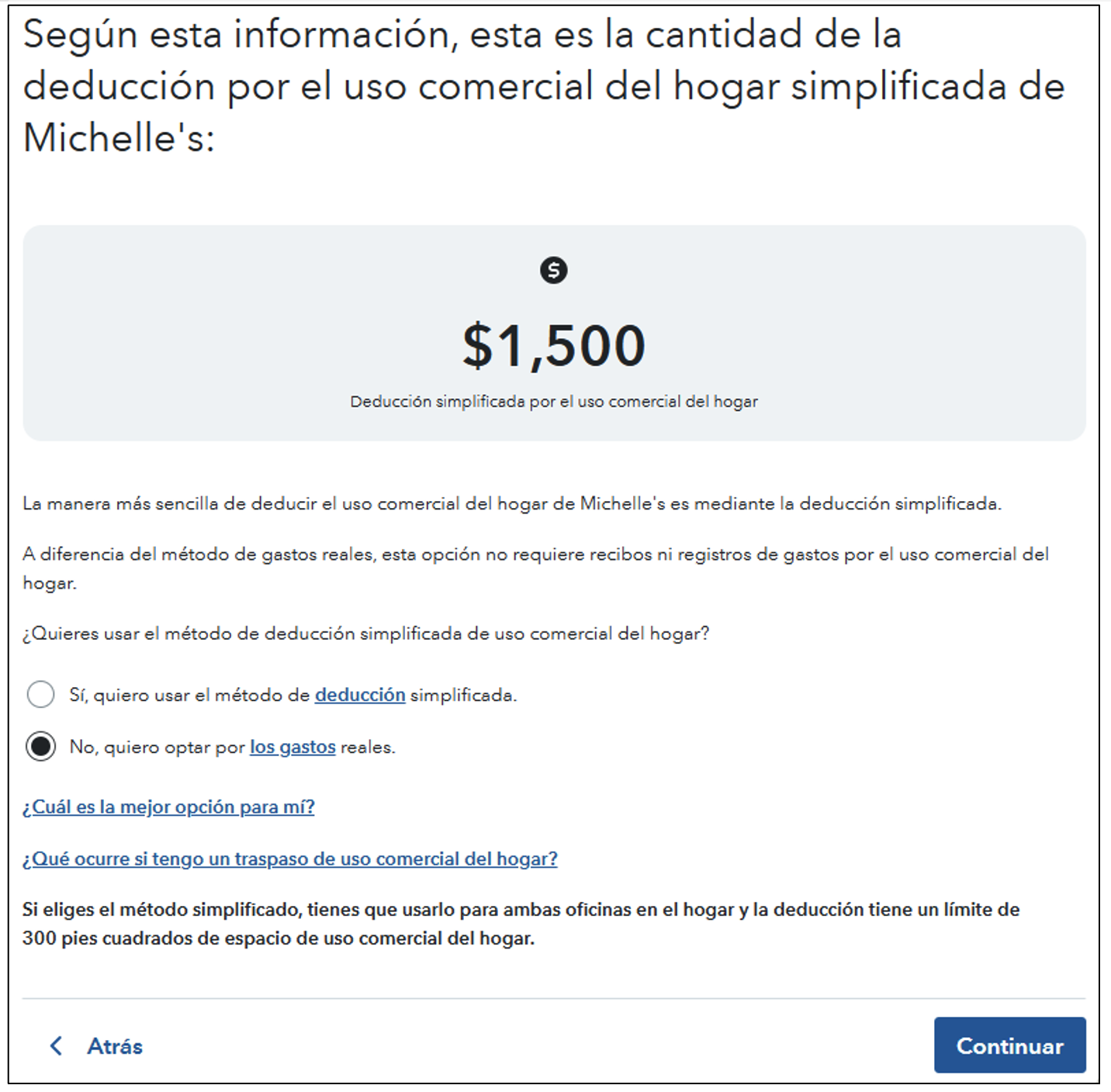 Nota Importante: TurboTax le recomendará que utilice la deducción simplificada de oficina en casa, que es un máximo de $1,500. Para muchos proveedores de cuidado infantil, el método simplificado representa menos que sus costos reales, por lo que deben usar el método de costos reales para determinar su deducción por oficina en casa.