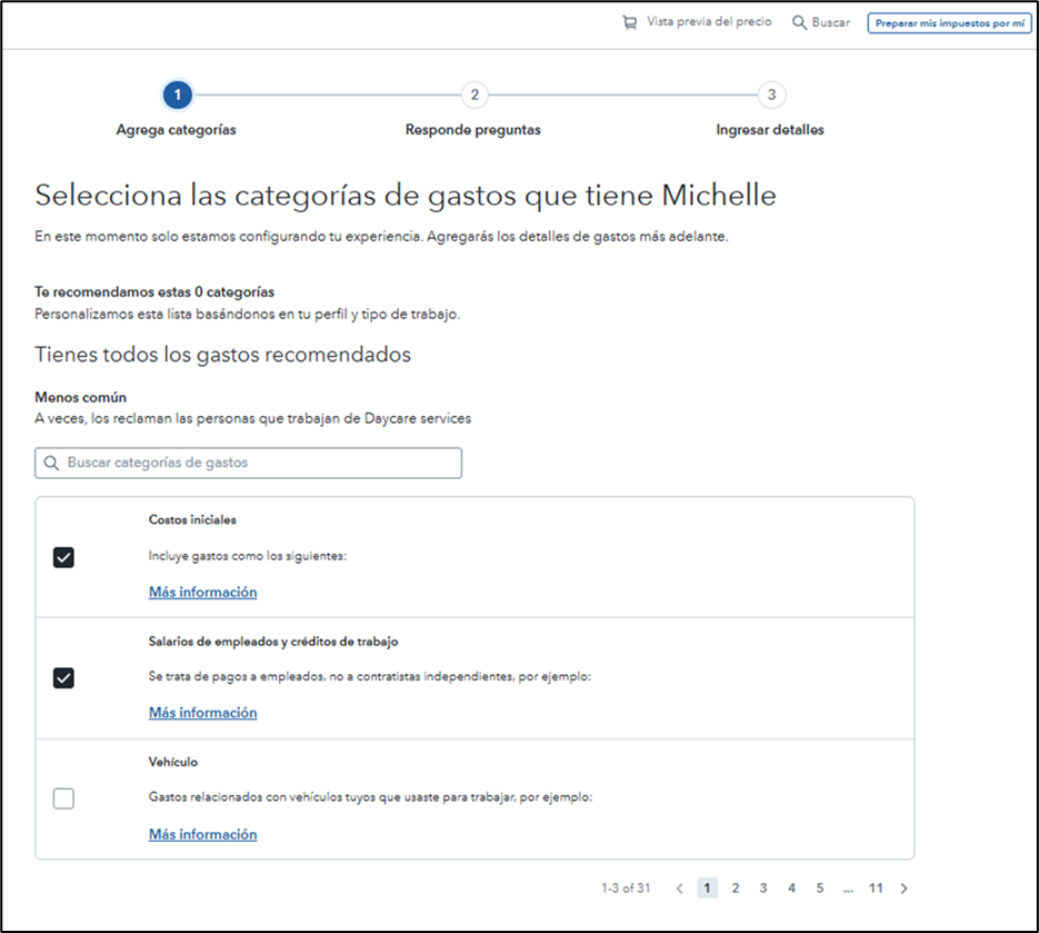 Primero podrá marcar sus gastos en la sección Recomendados, que serán gastos comunes como Suministros, Oficina en el hogar (este es el uso comercial de una casa para negocios de cuidado infantil familiar) y otros gastos. A continuación, tendrá la oportunidad de marcar todos los demás gastos que tenga en categorías menos comunes. Una vez que agregue estas categorías de gastos, puede marcarlas según corresponda a su situación.